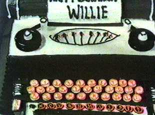 [camera slowly zooms in on corner of typewriter-shaped cake] Buddy: You ate the Z! Nancy: No, I didn't. Buddy (indignantly): The Z was here this afternoon! Nancy: All I ate was this little piece that was stuck to the inside, I went like this and... Buddy: Aha. The Z. Nancy: Well, I didn't mean to eat the Z. I didn't do it on purpose. Buddy: I bet. I bet. How was it? Nancy: Oh, it was... Buddy: Come on, Nancy! Nancy: Well, we're not celebrating a birthday -- Buddy: Leave the cake alone. [storms off upstairs] Nancy (looking at the cake longingly): Some zealot would miss the backspace...