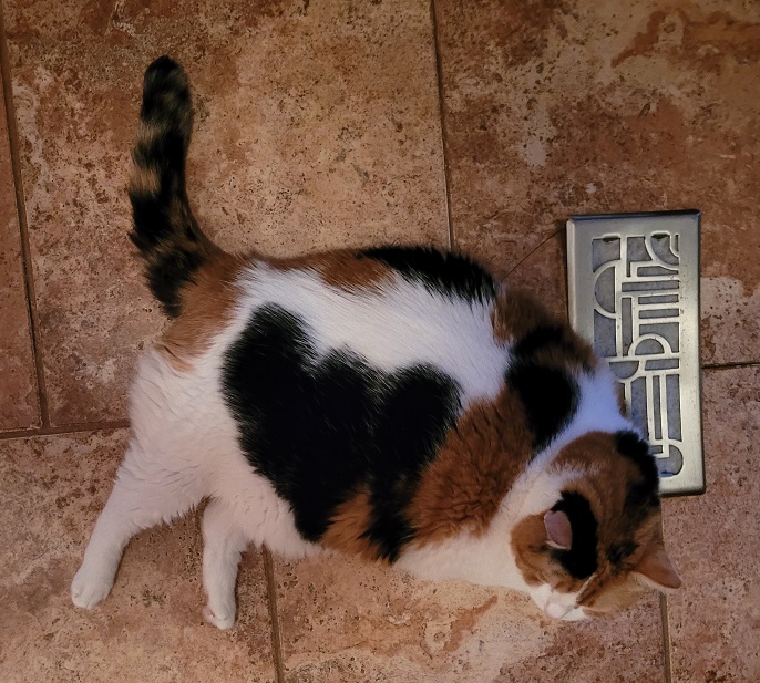 This is a goofy song about a goofy cat. (The song is goofy because it has no meter, only half the lines rhyme, etc.; it's just a little something a guy is humming to himself.) It makes two points: (1) she's very fat; (2) she's the love of the narrator's life.